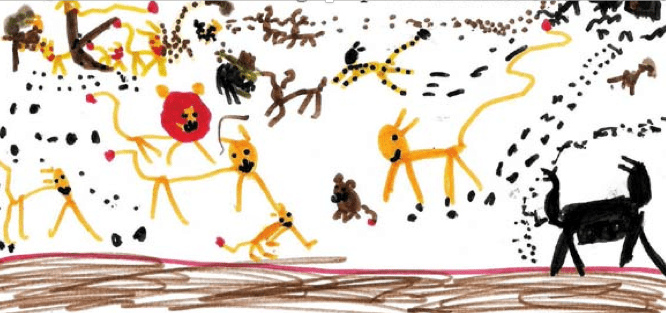 And Princess, 5 years old who lives in a typical middle-class suburban township in Melbourne Australia draws a picture of a host of seemingly joyful wild animals playing together and describes her drawing “This is my drawing of my dream um for the future. On the planet all children and animals would be free and not die”.