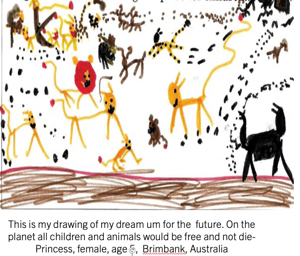Young children in Melbourne drawing worlds where animals live free.