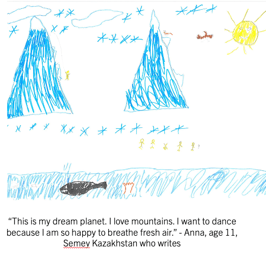 Let me leave you with the words of Anna, age 11, Semey Kazakhstan a city where 450 nuclear bombs were detonated by the Soviet union during the Cold War who writes: “This is my dream planet. I love mountains. I want to dance because I am so happy to breathe fresh air.”
